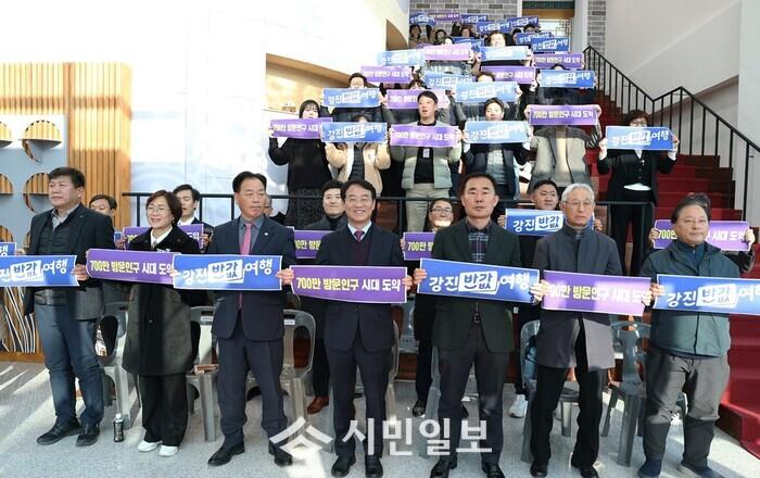 | ▲ 강진원 강진군수(앞줄 가운데)가 지난 11일 강진읍 동성리 사의재 일원에 조성한 ‘강진 여행자 쉼터’ 개관식에서 참석자 등과 강진 반값여행 강진방문 인구 700만 유치 퍼포먼스를 하고 있다. / 강진군 제공 |
