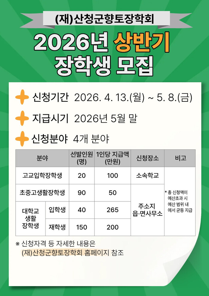 한편 산청군향토장학회는 지난 1999년부터 지역인재 육성과 우수 학생 유입을 위한 다양한 장학사업을 펼쳐오고 있다.