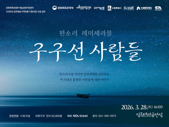 수원문화재단(대표이사 곽도용)은 정조테마공연장에서 오는 28일 오후 4시, 문화체육관광부와 예술경영지원센터의 ‘2026 공연예술 지역유통 지원사업’ 선정작인 ‘판소리 레미제라블 <구구선 사람들>’을 선보인다.