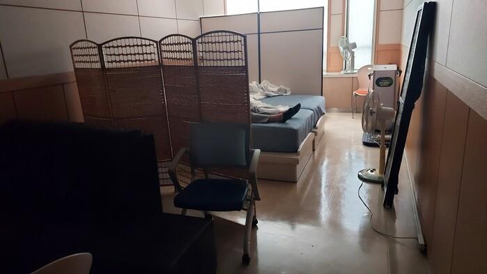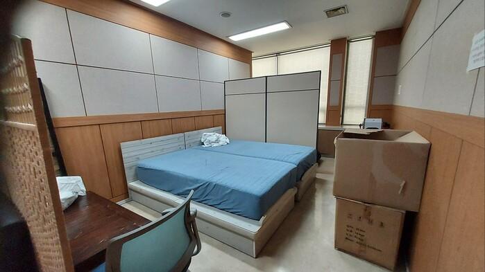 이곳에 비치된 침대는 예전 숙직실에서 사용하는 불용품인 침대를 휴게실로 옮겨 폐기처분하는 동안 휴게실에서 보관하면서 직원들 편의를 위해 사용되고 있다.