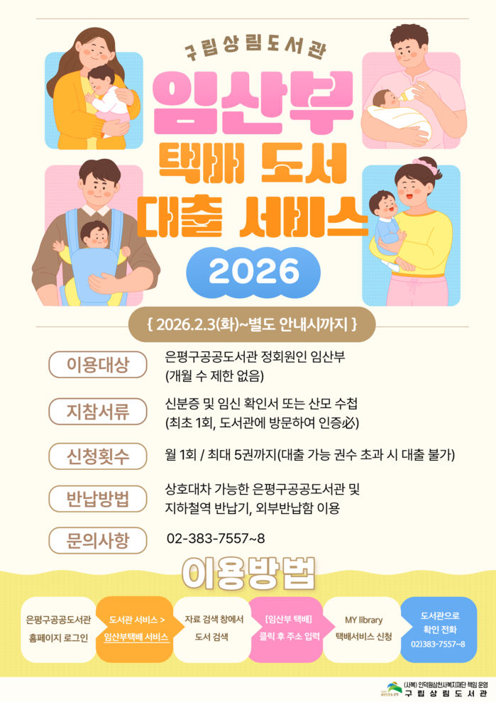 “임산부 택배 도서 대출 서비스”는 2월 3일(화)부터 별도 안내시까지 운영하며 임신 개월 수에 관계없이 임신 이후부터 출산 전까지의 임산부가 이용이 가능하다. 신청 가능한 자료는 도서관 소장자료 중 관외 대출이 가능한 도서이며, 1인당 5권씩 이용할 수 있다.