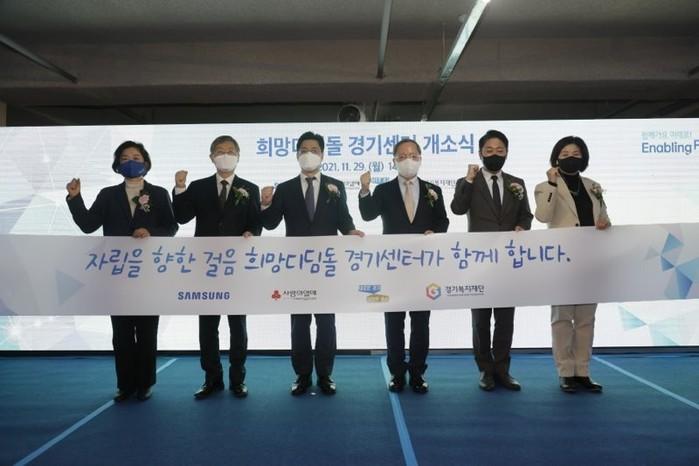 29일 문경희 경기도의회 부의장이 사회로 첫 걸음을 내딛는 청소년들이 안정적 환경에서 자립을 준비할 수 있도록 지원하는 ‘삼성희망디딤돌 경기센터 개소식’에 참석했다. 사진은 개소식 후 기념촬영을 하고 있는 문 부의장(왼쪽)과 내빈들의 모습. (사진제공=경기도의회)
