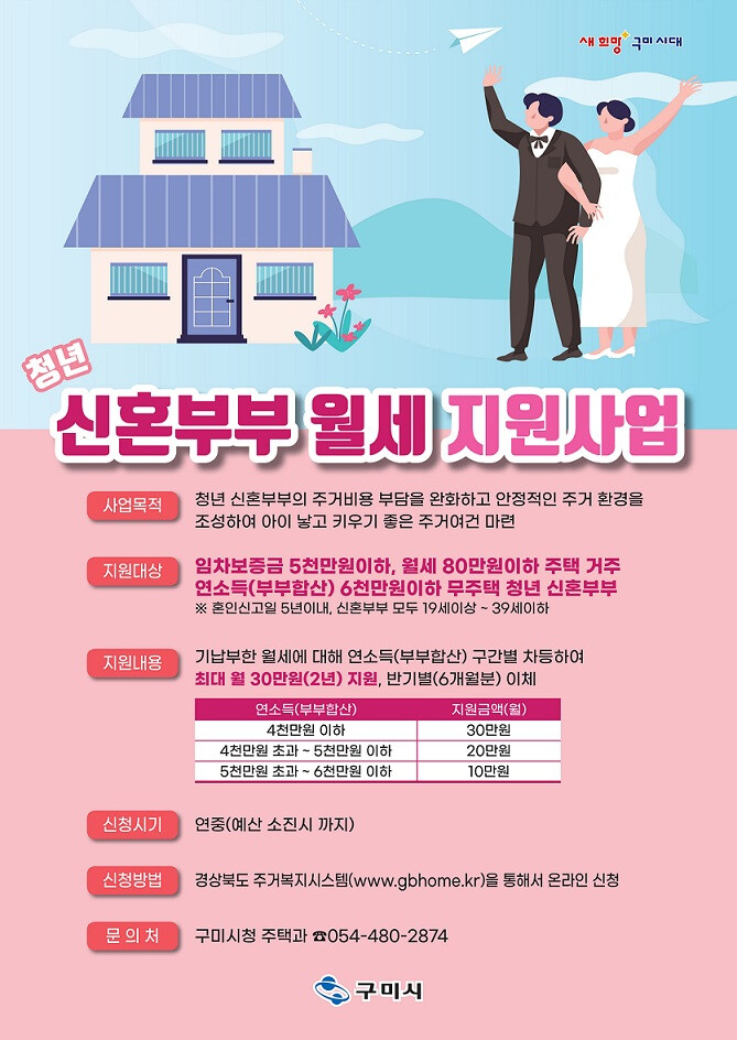 또한, 주거 부담 완화를 위한 사업도 추진한다. ‘신혼부부 임차보증금 이자 지원’ 사업은 임차보증금 5억 원 이하 주택에 대해 최대 2억 원까지 융자에 대한 이자를 연 최대 5.5% 범위에서 지원한다. 단, 부부 모두 구미시 거주 요건을 충족해야 한다.