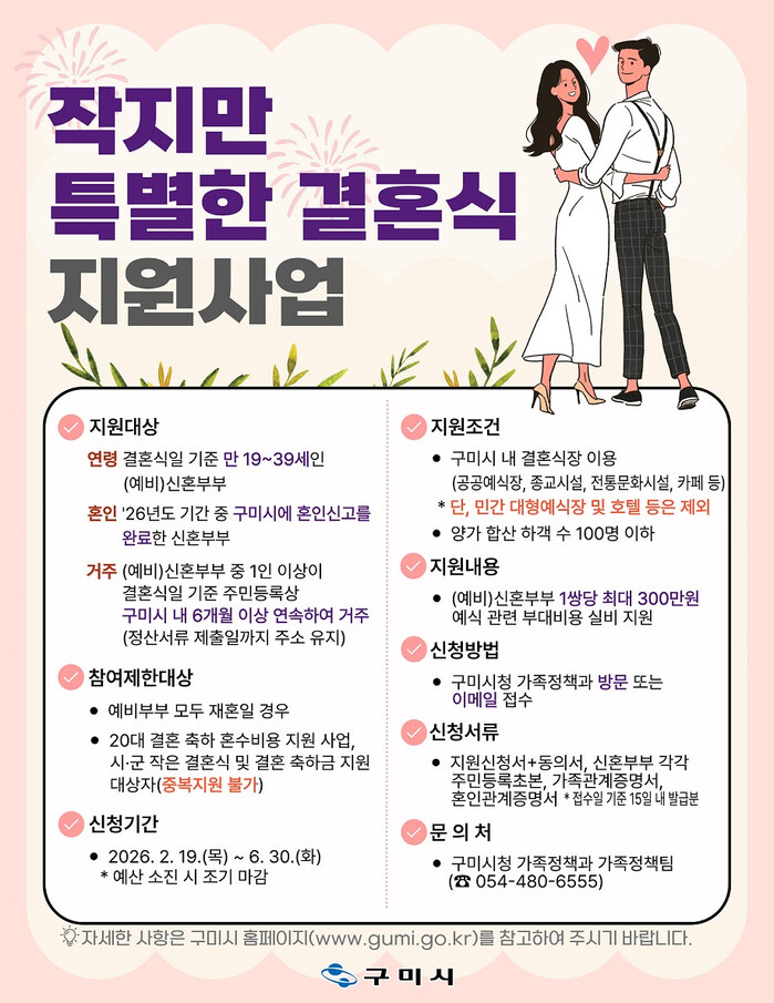 김장호 구미시장은 “결혼 부담을 줄이는 일은 행정의 역할”이라며 “청년과 신혼부부가 구미에서 미래를 설계하도록 실질적인 지원을 계속 확대하겠다”고 말했다.