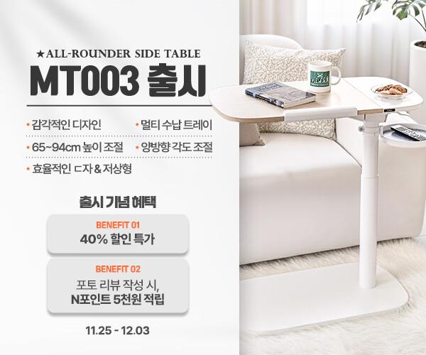MT003은 653~943mm로 높이 조절이 가능해 낮은 쇼파테이블부터 침대테이블, 스탠딩 이동식테이블 등 공간과 사용의 제약 없이 다양하게 사용할 수 있는 올라운더 높이조절테이블이다.