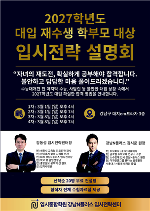 2부는 강남N플러스 김시운 원장이 진행한다. 김 원장은 현 대치동 수리논술 1타 강사로 알려져 있으며, 이번 설명회에서 수리논술 출제 경향과 대비 전략을 상세히 설명할 계획이다. 연세대·고려대 등 주요 대학별 논술 특징과 합격 사례를 분석하고, 의·치·약 등 메디컬 계열 수리논술의 출제 유형과 준비 방향도 함께 다룬다. 더불어 대학별 논술 준비방법, 수능 공부와의 효율적인 병행 전략, 논술 준비 과정에서의 시간 배분과 학습 관리 노하우를 제시해 논술전형을 고민하는 재수생 학부모들의 궁금증을 해소할 예정이다.