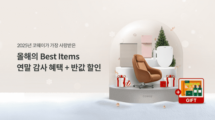 올해 코웨이닷컴에서 가장 많이 사랑받은 ‘BEST 4’ 제품은 ▲아이콘 정수기2 ▲스퀘어핏 공기청정기 ▲룰루 스스로케어 비데 ▲비렉스 트리플체어 안마의자로, 행사 기간 동안 최대 12개월의 렌탈료 반값 혜택으로 만나볼 수 있다. 해당 제품을 렌탈하는 고객 중 추첨을 통해 400명에게는 ‘에르메스 오도렌지 베르테 바디 3종 세트’도 증정한다.