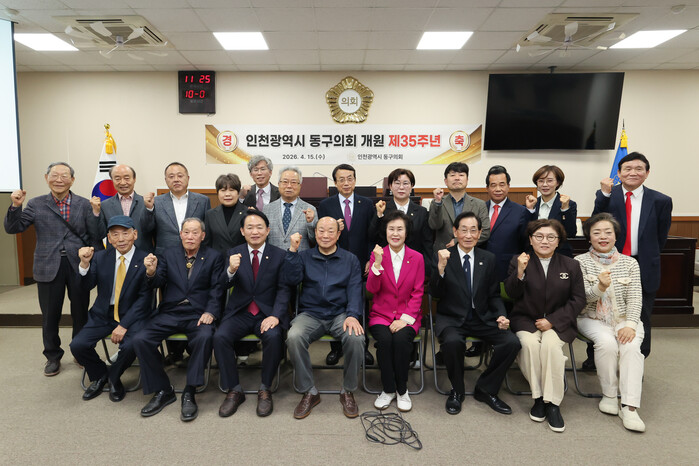 인천 동구의회가 지난 15일 의장실 및 본회의장에서 ‘동구의회 개원 35주년 기념행사’를 개최했다. 동구의회는 1991년 4월15일 개원해 올해로 개원 35주년을 맞이했으며 이날 행사는 유옥분 의장을 비롯한 의원들과 구청장, 의정회 회원 등이 참석한 가운데 진행됐다. 사진은 행사 참석자들이 기념촬영을 하고 있는 모습. (사진=인천 동구의회 제공)