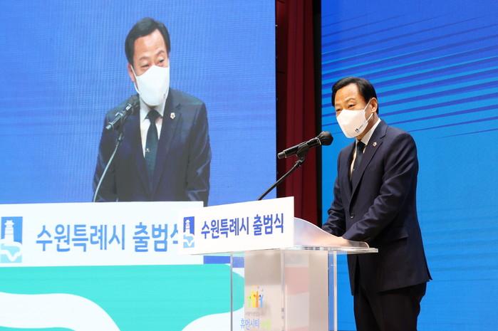 장현국 경기도의회 의장이 최근 수원특례시청 대강당에서 실시된 ‘수원특례시 출범식’에 참석했다. 사진은 출범식에 참석한 장 의장이 축사를 하고 있는 모습. (사진제공=경기도의회)