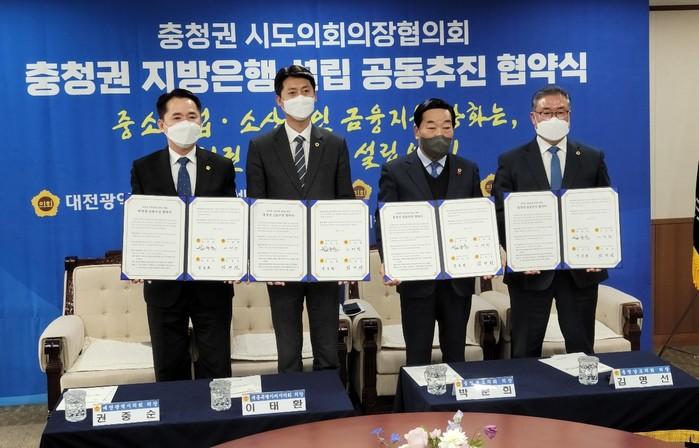 김명선 충남도의회 의장과 권중순 대전시의회 의장, 이태환 세종시의회 의장, 박문희 충북도의회 의장은 21일 충남도의회 국제회견장에서 충청권 지방은행 설립 추진을 위한 공동협약식을 개최했다. (왼쪽부터)권중순 대전시의회 의장, 이태환 세종시의회 의장, 박문희 충북도의회 의장, 김명선 충남도의회 의장.
