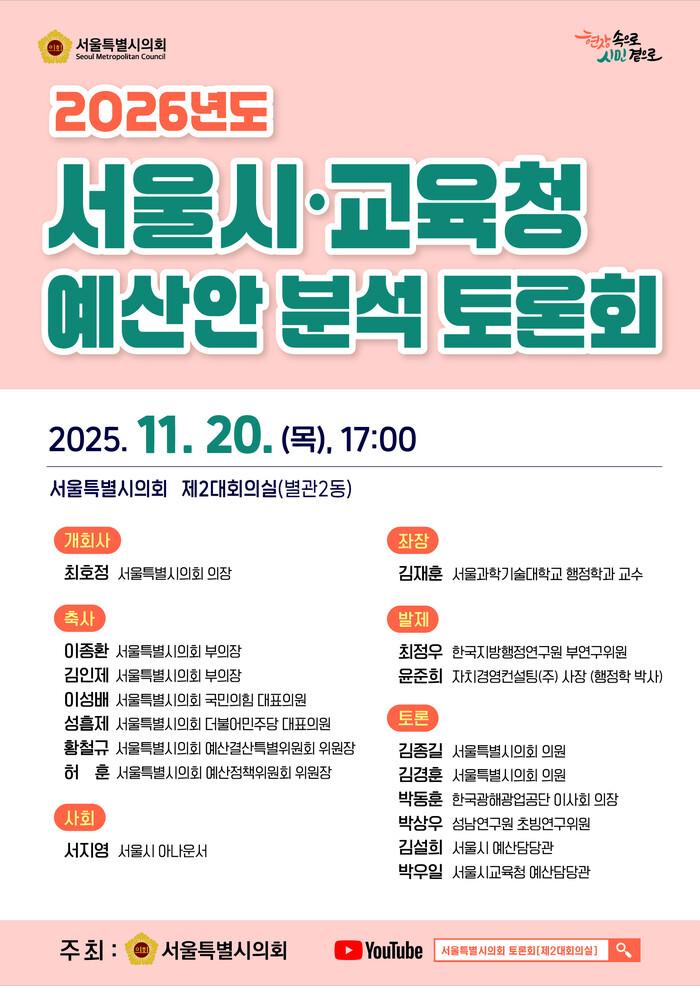 [시민일보 = 이대우 기자] 서울시의회(의장 최호정)가 제2대회의실에서 20일 오후 5시 ‘2026년도 서울시·교육청 예산안 분석 토론회’를 개최한다.