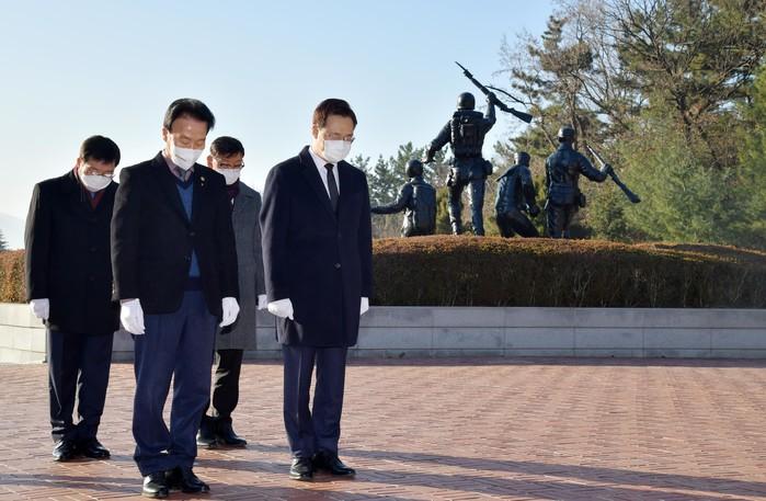 하병필 경남도지사 권한대행(오른쪽)과 김하용 경남도의회 의장이 3일 국립 3·15민주묘지와 창원충혼탑을 방문해 신년 참배하고 있다.