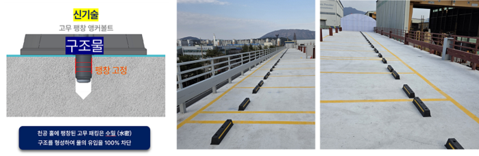 업체 관계자는 “'고무 팽창형 방수 앵커볼트'는 천공 홀 내부에 삽입된 고무 패킹관이 체결 과정에서 천공 홀 내부에 팽창 고정되어 수밀(水密) 구조를 형성하며, 탄성 복원력을 기반으로 외부 충격 및 진동 등 가혹한 환경에서도 흡수ㆍ분산하는 완충 역할을 수행하여 체결 안정성을 유지하도록 설계되어있다”며 설명했다.