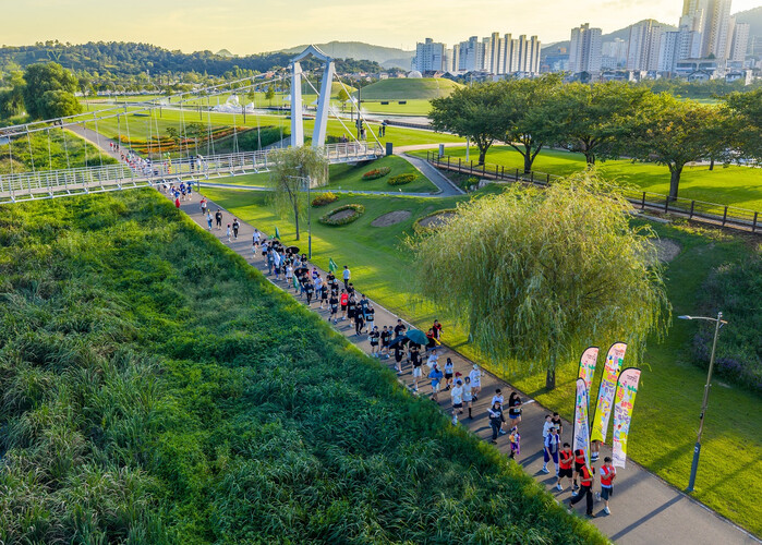 | ▲ 쉴랑게 펀워크 참가자 150여명이 오천그린광장에서 출발해 동천을 따라 걷고 있다. (사진=순천시청 제공) |