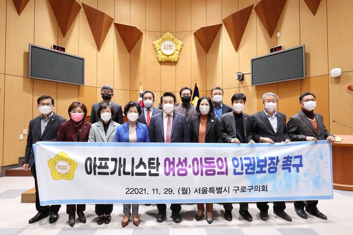 최근 서울 구로구의회가 제305회 정례회 제1차 본회의에서 ‘아프가니스탄 여성과 아동들의 인권보장을 촉구하는 결의안’을 만장일치로 채택했다. 사진은 의원들이 결의안을 채택한 후 기념촬영을 하고 있는 모습. (사진제공=구로구의회)