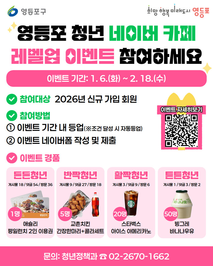 [시민일보 = 여영준 기자] 영등포구(구청장 최호권)가 지역 청년들의 온라인 소통과 커뮤니티 참여를 확대하기 위해 ‘영등포 청년 네이버 카페 회원 레벨업 이벤트’를 진행한다고 밝혔다.