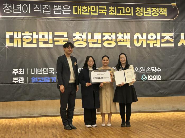 | ▲ 청년재단 ‘청년다다름사업’이 ‘대한민국 청년정책 어워즈’ 비영리 부문 최우수상을 수상하고 있다. (사진=청년재단 제공) |