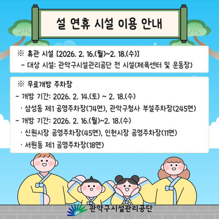 [시민일보 = 문민호 기자] 관악구시설관리공단은 2026년 민족 대명절 설을 맞이하여, 연휴 기간 동안 지역 주민과 귀성객들이 편안하게 명절을 보낼 수 있도록 관악구 내 주요 공영주차장 및 부설주차장을 무료로 개방한다.