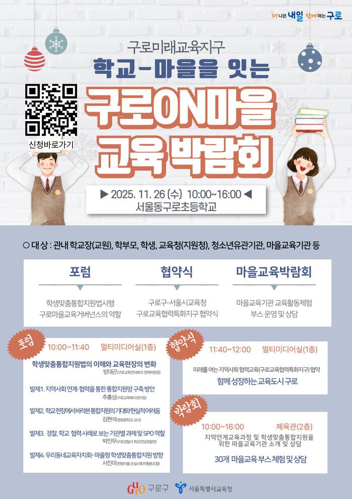 장인홍 구청장은 “학교와 마을이 함께 아이들의 성장을 지원하는 것은 지역의 미래를 만드는 일”이라며 “이번 박람회가 구로형 학생맞춤통합지원 모델을 구체화하는 계기가 되길 바란다”고 말했다.