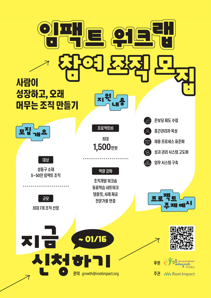 이태호 성동미래일자리주식회사 대표는 "사회적 가치를 실현하는 임팩트 조직이 건강한 조직문화와 제도를 갖추고 함께 성장해야 한다는 현장의 필요성을 느껴 이번 후원을 결정했다"라며 "이번 프로그램이 지역사회와 임팩트 생태계의 질적 성장에 도움이 되길 바란다"라고 말했다.