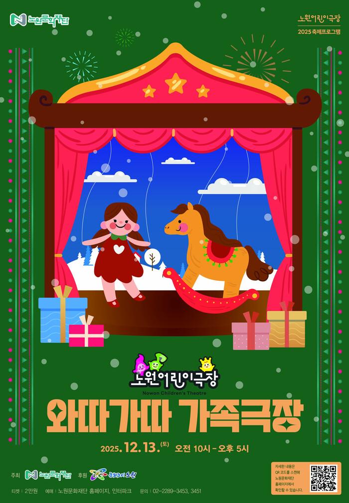 [시민일보 = 박소진 기자] 어린이 전용 문화공연 예술공간인 노원어린이극장이 하루 동안 극장에서 놀이터로 변신한다. 노원문화재단은 오는 13일 오전 10시부터 오후 5시까지, 겨울 가족 축제 ‘와따가따 가족극장’을 개최한다고 밝혔다.