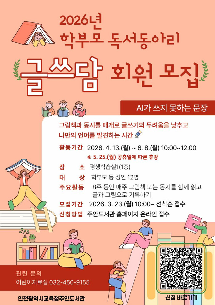 [인천=문찬식 기자] 인천광역시교육청주안도서관(관장 최문정)은 학부모의 인문학적 소양을 함양하고 가정 내 독서문화를 확산하기 위하여, 오는 23일부터 학부모 독서동아리 ‘글쓰담’ 회원을 모집한다.