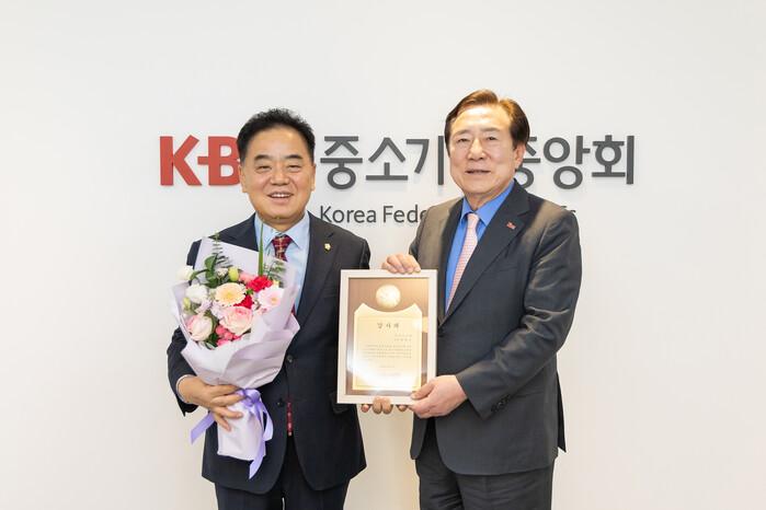 | ▲ 정대근 의장(왼쪽)이 중소기업중앙회로부터 감사패를 수여받고 기념 촬영을 하고 있다. (사진=구로구의회 정대근 의장 개인 제공) |