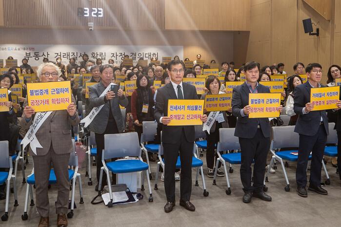 이날 결의대회에 참석한 공인중개사 전원은 ‘부동산 거래질서 확립 자정선언문’을 채택하고, ▲전세사기 가담·방조 행위 금지 ▲거래당사자에 대한 투명한 정보 제공 ▲위험 거래 사전 차단 ▲법과 원칙에 따른 공정하고 책임감 있는 중개 ▲불법 중개행위 금지 등의 실천 과제를 선언하며 공정한 거래문화 조성에 적극 나설 것을 다짐했다.