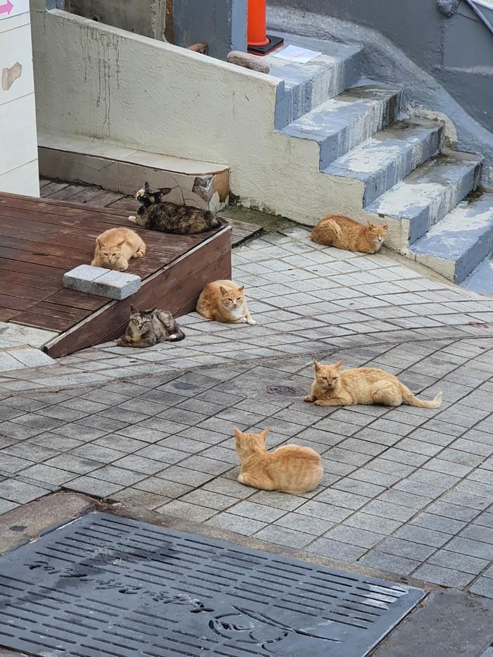 | ▲ 천연기념루 보호구역 '홍도'가 들고양이 출몰로 각종 생활 피해가 급증해 골머리를 앓고 있다(홍도 섬사랑 모텔 앞에 모여있는 들고양이 모습).출처=신안군 홍도 출장소 |