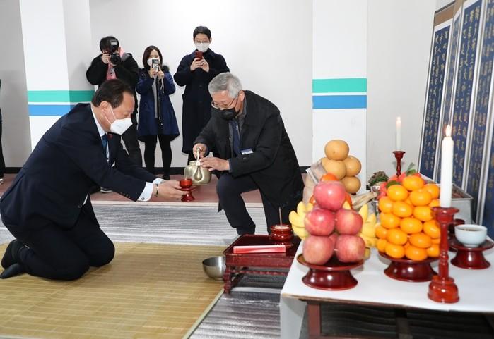 유동균 서울 마포구청장이 최근 ‘마포동 불당제’에 참석해 지역의 안녕을 기원했다. 이날 행사에서는 화재 예방과 지역의 안녕을 기원하는 봉제를 거행하고 주민화합의 장도 열렸다. 사진은 이날 제를 올리는 유 구청장(왼쪽)의 모습. (사진제공=마포구청)