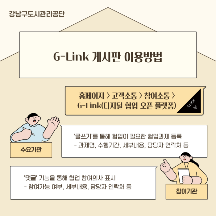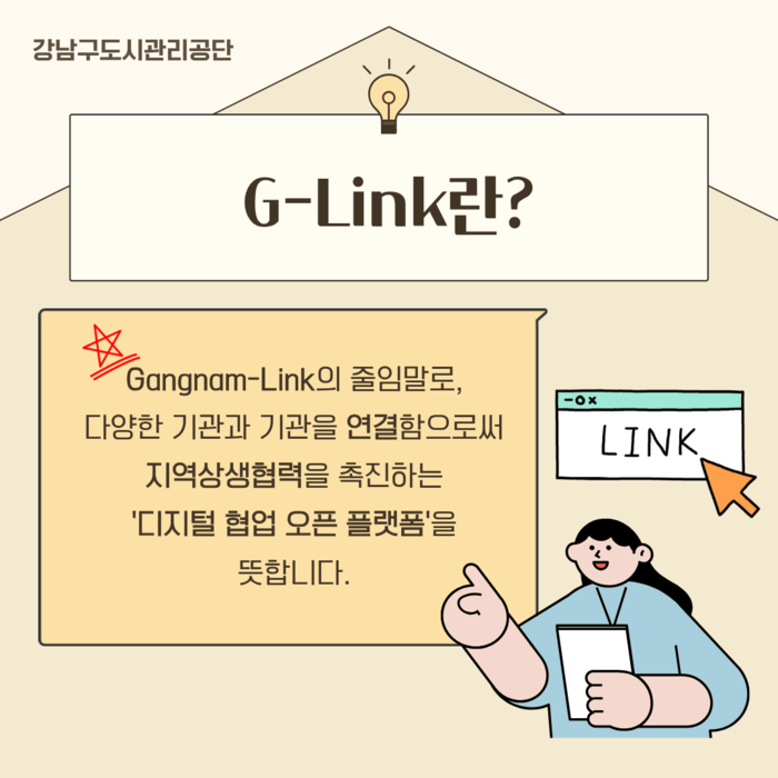 'G-Link'는 Gangnam-Link의 줄임말로 중앙행정기관과 지방자치단체, 공공기관, 민간단체, 기업 등 다양한 기관과 개인이 참여해 필요한 역량과 자원을 공유하는 개방형 플랫폼이다. 협업이 필요한 기관을 디지털 방식으로 연결해주는 기능을 갖췄다.