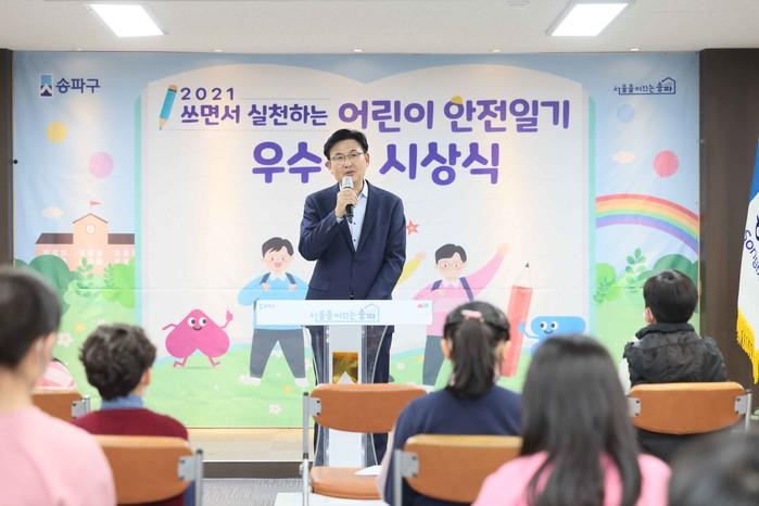 서울 송파구는 최근 ‘2021 어린이 안전일기 우수작 시상식’을 개최했다. 구는 16개 지역내 초등학교 3~5학년 학생들이 여름방학 동안 작성한 안전일기를 추천받아 64편의 우수작을 선정했다. 사진은 시상식에 박성수 구청장이 인사말을 하는 모습. (사진제공=송파구청)