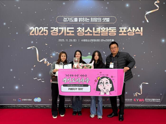 [의왕=송윤근 기자] 경기 의왕시청소년재단(이사장 김성제) 부곡동청소년문화의집 카페지기 ‘피치’가 「2025년 경기도 청소년 자원봉사대회」에서 경기도지사상을 받았다. 이번 수상은 카페지기 ‘피치’가 2023년과 2024년에 경기도교육감상을 받은 데 이어 이뤄낸 3년 연속 수상의 영예다.