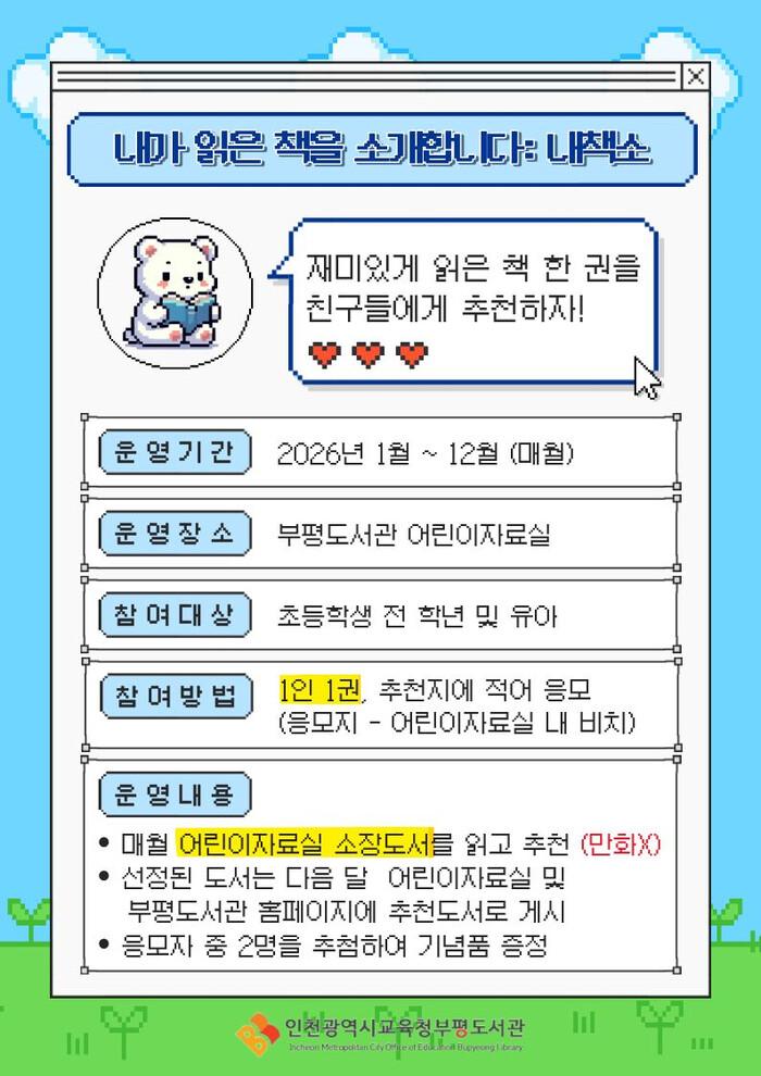 [인천=문찬식 기자] 인천광역시교육청부평도서관(관장 김재영)은 2026년 한 해 동안 어린이가 직접 참여하는 독서활동 ‘내가 읽은 책을 소개합니다(내책소)’를 운영한다.