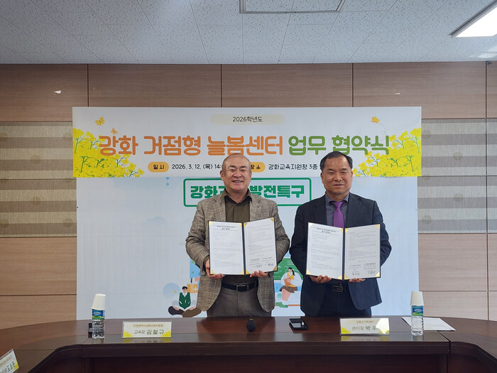 [인천=문찬식 기자] 인천강화교육지원청(교육장 김철규)은 지난 12일 교육지원청 및 강화군가족센터 관계자가 참석한 가운데, 강화군가족센터와 주말 돌봄 공백 해소를 위한 ‘2026년 강화 거점형 늘봄센터 위탁운영 협약’을 체결했다.