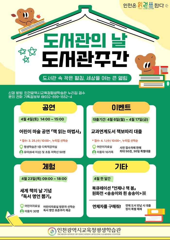 [인천=문찬식 기자] 인천광역시교육청평생학습관(관장 이재길)은 제4회 도서관의 날과 도서관주간을 기념하여 4월 한 달간 지역 주민을 위한 다양한 독서문화 행사를 운영한다.
