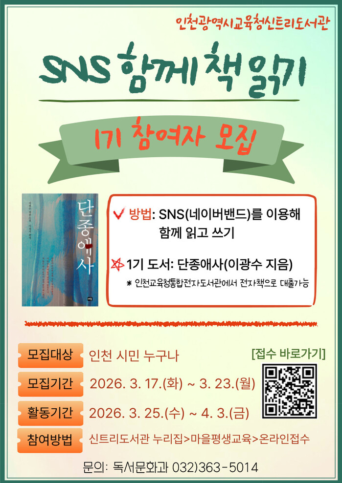 [인천=문찬식 기자] 인천광역시교육청신트리도서관(관장 정경애)은 인천 시민의 일상 속 독서 실천을 지원하기 위해 온라인 독서 프로그램 ‘2026년 SNS 함께 책 읽기’를 운영한다.
