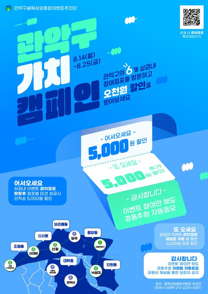 [시민일보 = 여영준 기자] 관악구(구청장 박준희)는 높은 물가 속 여름 휴가철을 맞아 오는 14~23일 소상공인과 함께하는 ‘골목상권 이용촉진 통합이벤트’를 진행한다고 밝혔다.