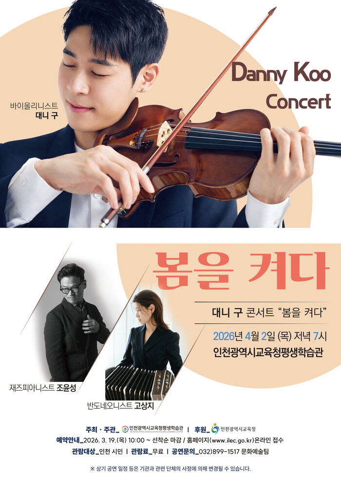 공연은 ‘봄을 켜다’라는 주제로 바이올리니스트 대니 구의 따뜻한 감성이 돋보이는 연주를 중심으로, 피아니스트 조윤성과 반도네온 연주자 고상지의 협연이 더해져 클래식 애호가와 일반 시민 누구나 편안하게 즐길 수 있는 무대를 선보일 예정이다.
