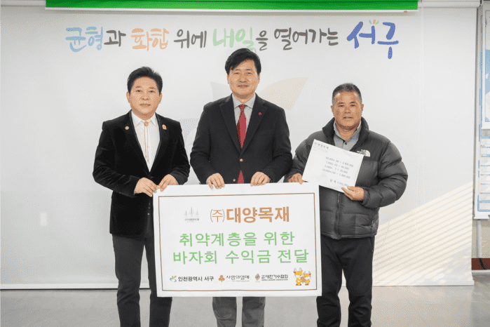 [인천=문찬식 기자] 인천 서구(구청장 강범석)는 ㈜대양목재(대표이사 김진원)로부터 지난 29일 취약계층을 위한 ㈜대양목재의 바자회 수익금을 전달받았다. 이번 바자회는 사단법인 대한가수협회(회장 박상철)의 후원을 받아 진행됐다.