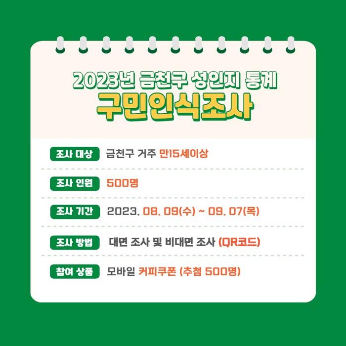 [시민일보 = 여영준 기자] 금천구(구청장 유성훈)는 오는 9월5일까지 구에 거주하는 만 15세 이상 500명을 대상으로 ‘2023 성평등 실태조사’를 한다고 밝혔다.