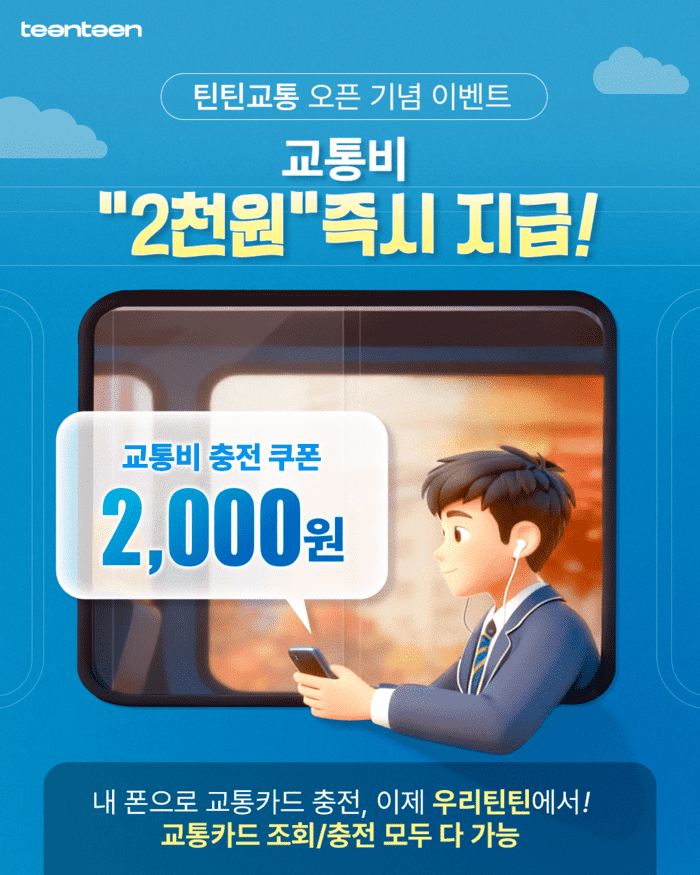 이달 10일부터 31일까지 진행되는 이번 이벤트는 ‘틴틴교통 서비스’ 이용에 동의한 선착순 5000명에게 2000원 교통비 쿠폰을 제공한다. 쿠폰은 ‘틴틴교통 서비스’ 내 선물함에서 확인 후 바로 사용할 수 있다.