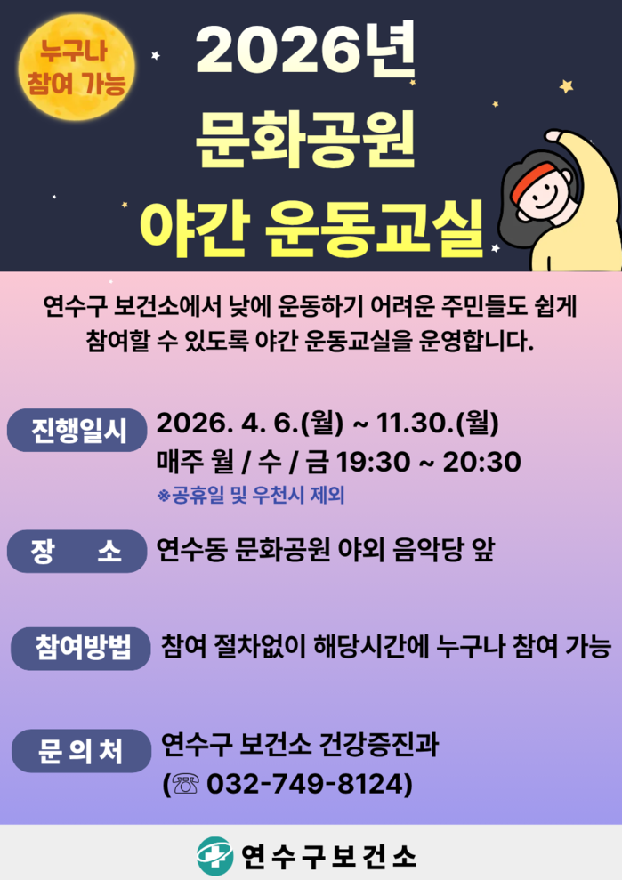 [인천=문찬식 기자] 인천 연수구(구청장 이재호) 보건소는 이달부터 구민의 건강 증진과 일상 속 꾸준한 운동 습관 형성을 위해 문화공원에서 ‘야간 운동교실’을 운영한다.