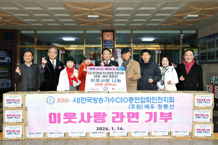 [인천=문찬식 기자] (사)한국방송가수연합회 인천지회(회장 금진)가 지난 16일 라면 30상자(100만원 상당)를 인천 동구에 기탁했다.