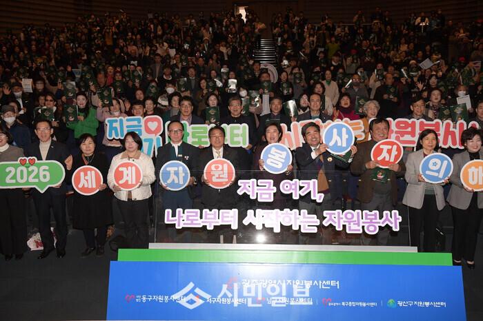 | ▲ 강기정 광주광역시장(앞줄 왼 쪽부터 여섯 번째)이 11일 오전 시청 대회의실에서 열린 ‘2025년 광주시 자원봉사자대회’에 참석해 축사를 한 후 참석자들과 함께 2026 세계자원봉사자의 해 퍼포먼스를 하고 있다. /광주광역시 제공 |