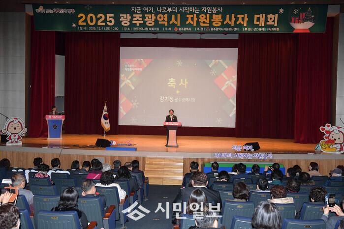 | ▲ 강기정 광주광역시장이 11일 오전 시청 대회의실에서 열린 ‘2025년 광주시 자원봉사자대회’에 참석해 축사를 하고 있다. /광주광역시 제공 |