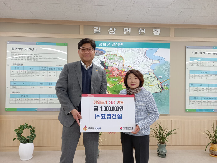 [인천=문찬식 기자] 인천 강화군 길상면(면장 서광석)은 지난 11일, ㈜효영건설(대표 나인숙)에서 지역 내 어려운 이웃을 위해 사용해 달라며 이웃돕기 성금 100만 원을 기탁했다고 밝혔다.