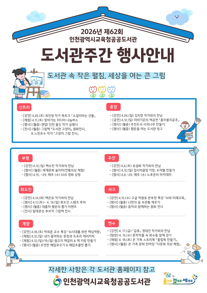 [인천=문찬식 기자] 인천광역시교육청 공공도서관은 제62회 도서관주간을 맞아 4월 한 달간 ‘도서관 속 작은 펼침, 세상을 여는 큰 열림’을 주제로 다양한 독서문화행사를 운영한다.