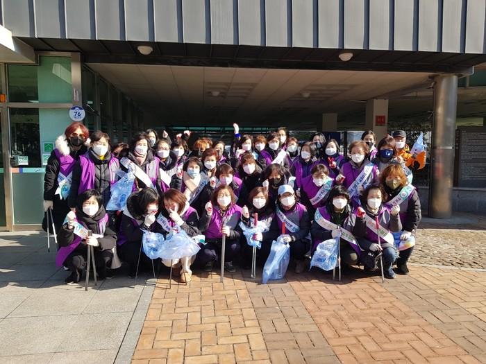 경기 안산시 단원구 중앙동 통장협의회는 최근 중앙역 앞 중심상가 지역 일원을 중심으로 도로변·상가 골목 등에 무단 투기된 쓰레기를 수거하는 등 환경정화활동을 했다. 사진은 이날 참여한 봉사자들이 기념촬영을 하는 모습. (사진제공=단원구청)