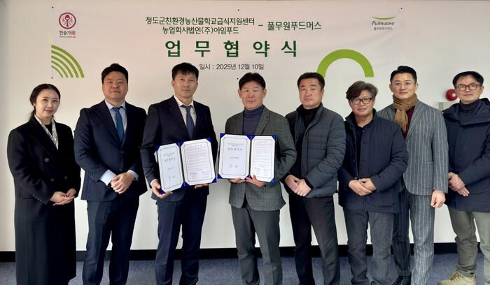 10일 청도군에 위치한 ㈜아임푸드 본사에서 열린 협약식에는 풀무원푸드머스 Kids 영업부 유선일 지점장과 청도군 친환경농산물 학교급식지원센터 서권환 센터장 등 양측 관계자들이 참석한 가운데 진행됐다.